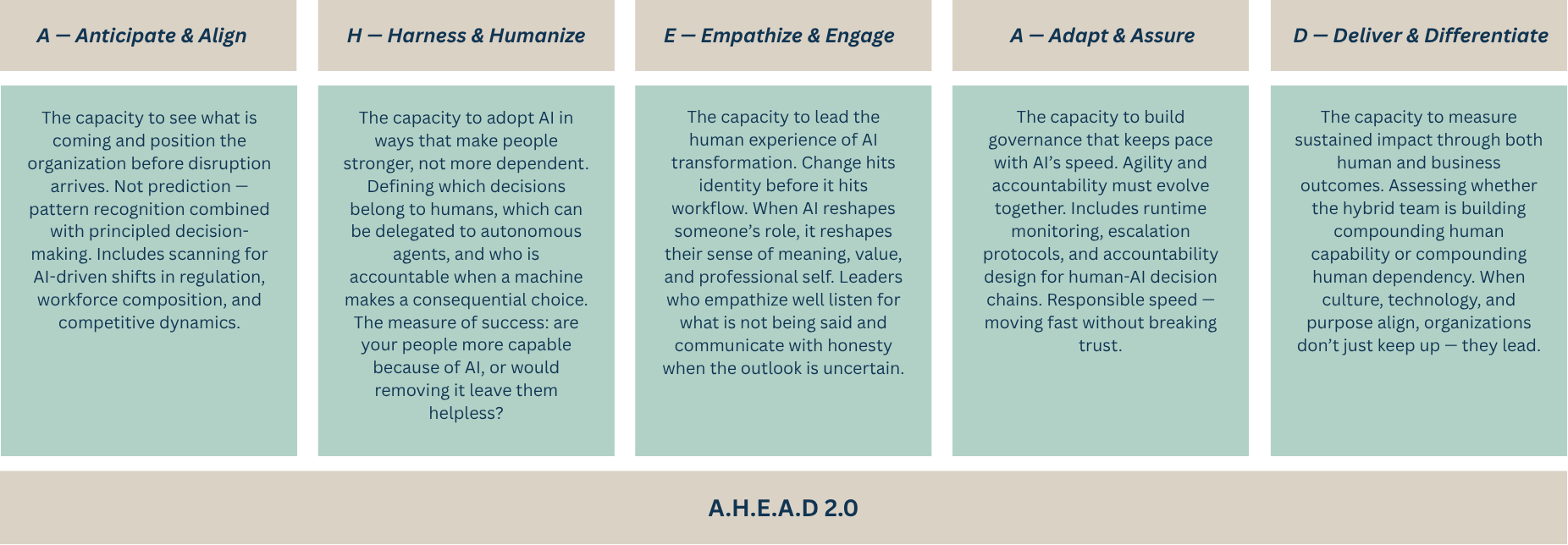 A.H.E.A.D. 2.0 is a leadership capability model for organizations where AI is no longer a project but a permanent condition.