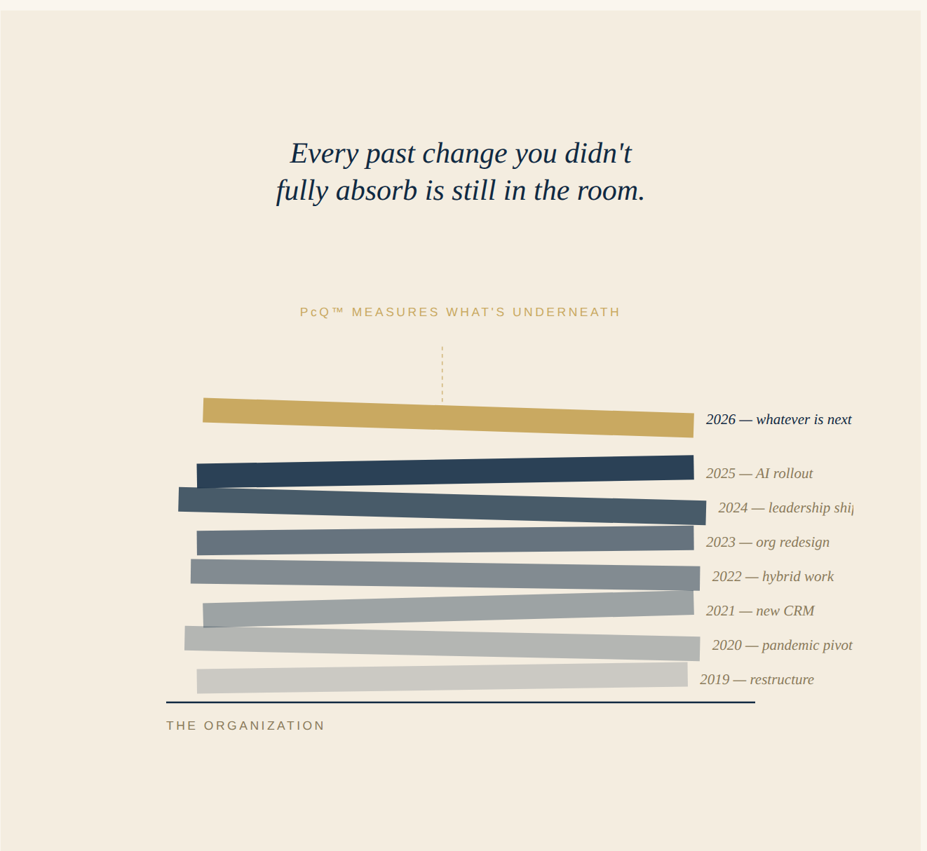 People Change Intelligence™ (PcQ™) measures and builds an organization's human capacity to absorb, lead, and sustain change. Not to endure it. To be strengthened by it.